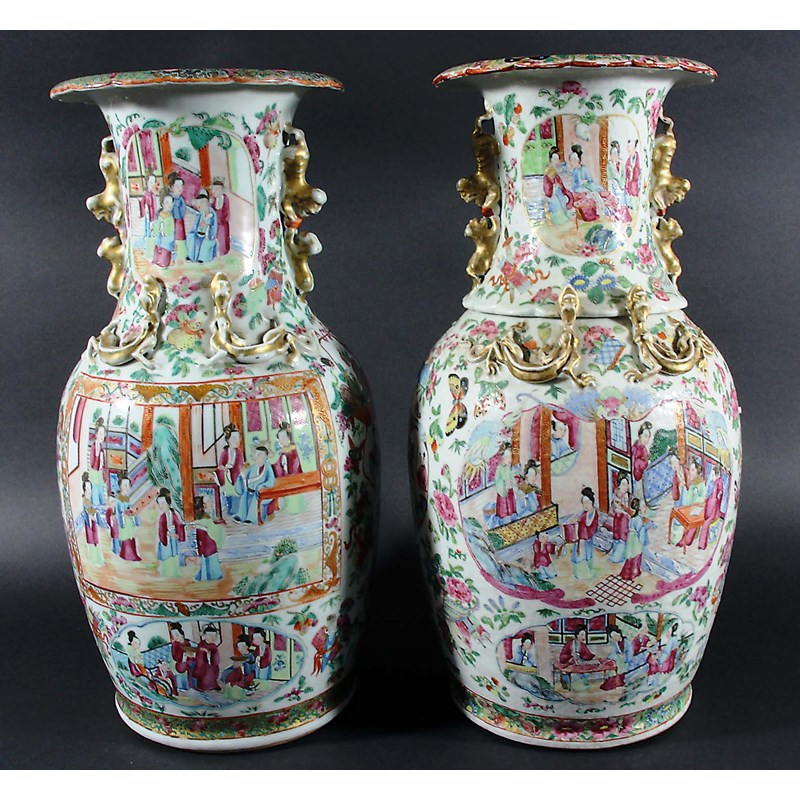 19th century, painted in the Canton style with panels of genre interior scenes beneath necks applied with kylins, height 43cm (2)