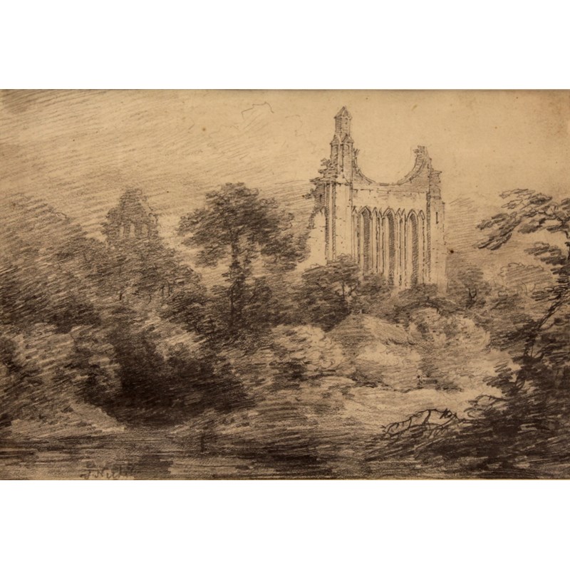 comprising works by or attributed to William Collins, village view, 11 x 18.5cm.; Thomas Hartley Cromek, ox and carts, 3.5 x 11cm.; George Sheffield, vessels at sea, 21 x 16cm.; Francis Nicholson, Byland Abbey, 18 x 26.5cm.; Francis Pocock, High Tor from the Hagwood, 14.5 x 28cm.; George Cuitt, tree study, 17.5 x 19cm.; and another of riders near a keep, 16.5 x 12.5cm. (7)