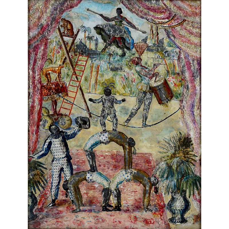 Oil, ink and silver foil on glass, within a plain maple-veneered frame