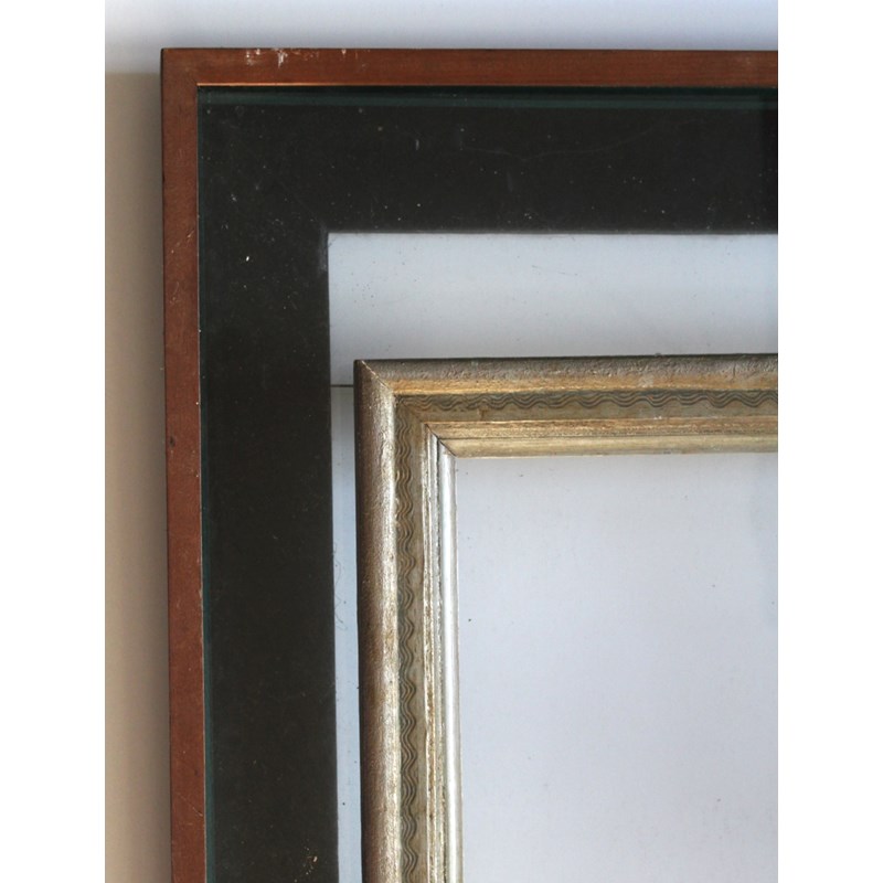 a plain wood deep (6cm) box frame with green velvet mount, to fit picture 61 x 51cm.; with a plain Rowley gallery frame, painted silver/grey, with a sinuous painted frieze, to fit picture 50 x 71cm. (2)