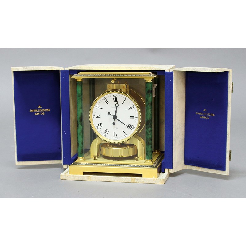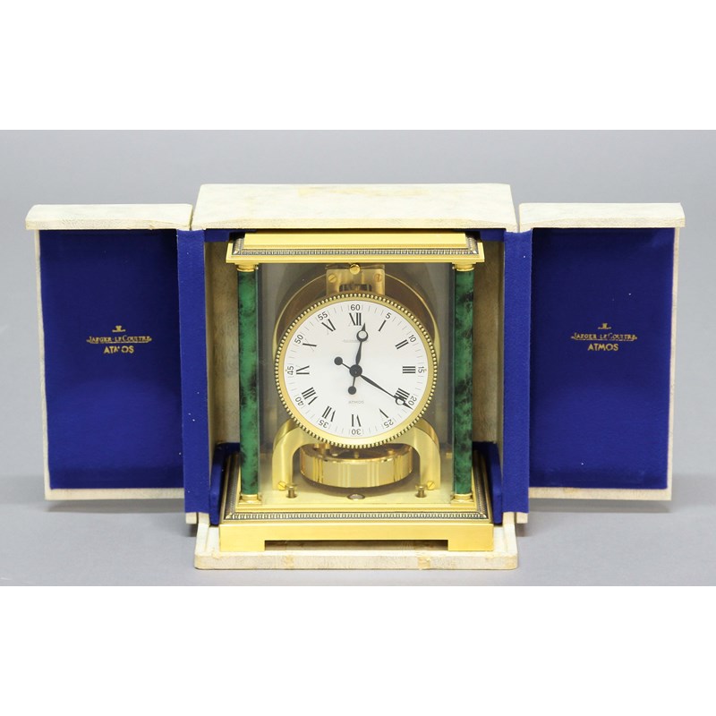 Vendome model, the enamelled dial on a brass movement, the glazed case with malachite style columns, with original case, receipt of purchase from Garrards, guarantee and other literature, height 24cm