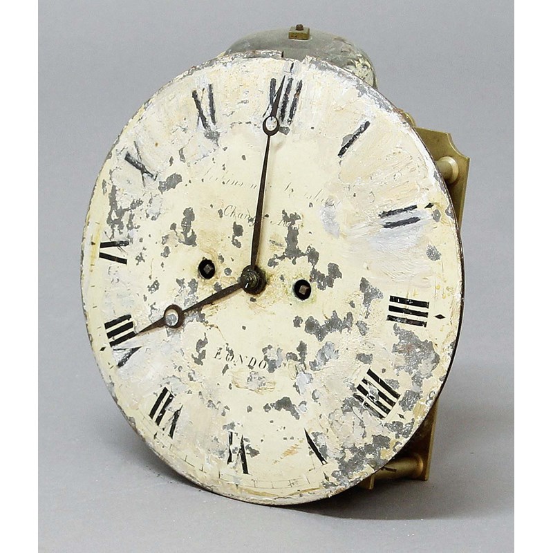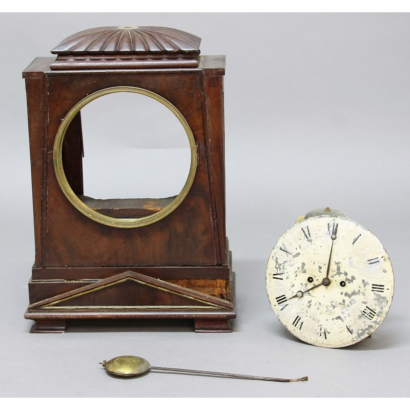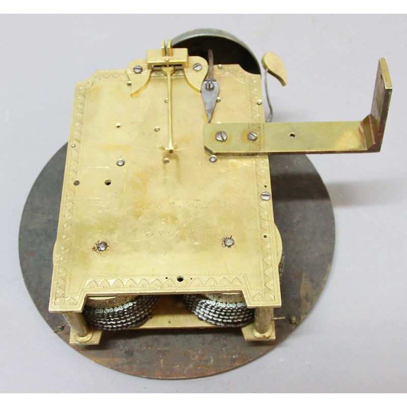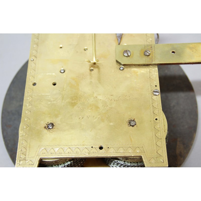 the 9" enamelled dial inscribed Parkinson & Frodsham/Change Alley/London, on a brass, four pillar, eight day, twin chain fusee movement hourly striking to a bell, the back plate similarly inscribed, the case with caddy style top and brass, gothic pierced grilles, as found, height 55cm