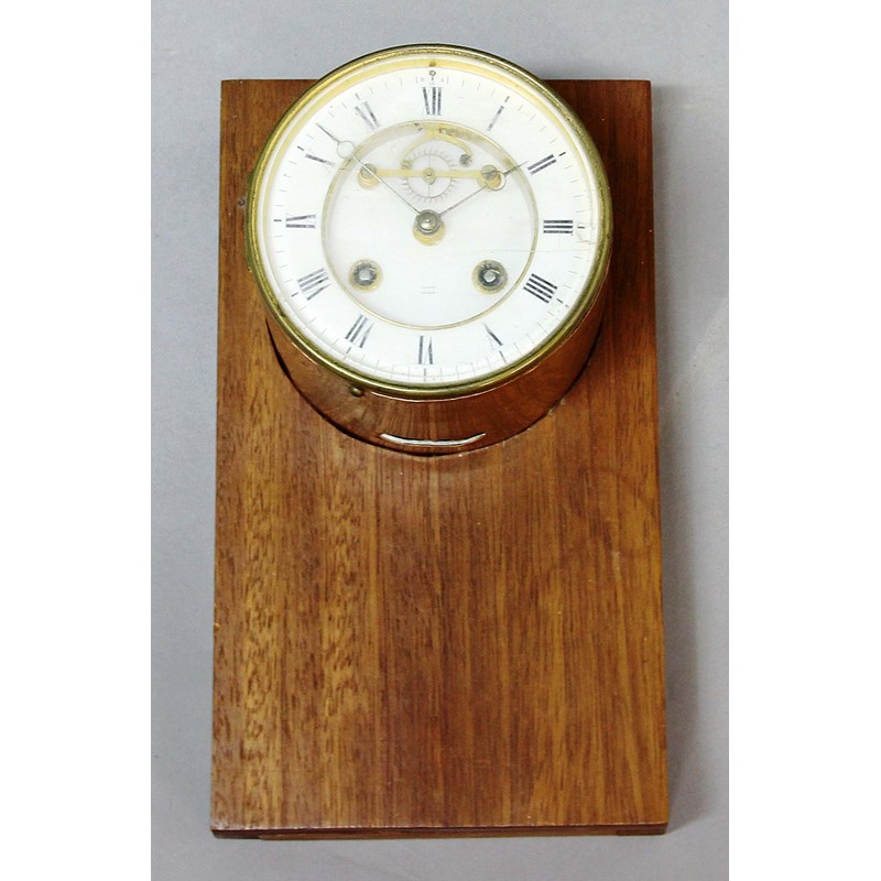 the 4 1/2" enamelled dial with visible anchor escapement, inscribed Dent a Paris, on a brass, eight day movement striking to a bell and inscribed Dent, 33 Cockspur Street, London, now mounted on a mahogany back board, with pendulum, diameter 13.5cm