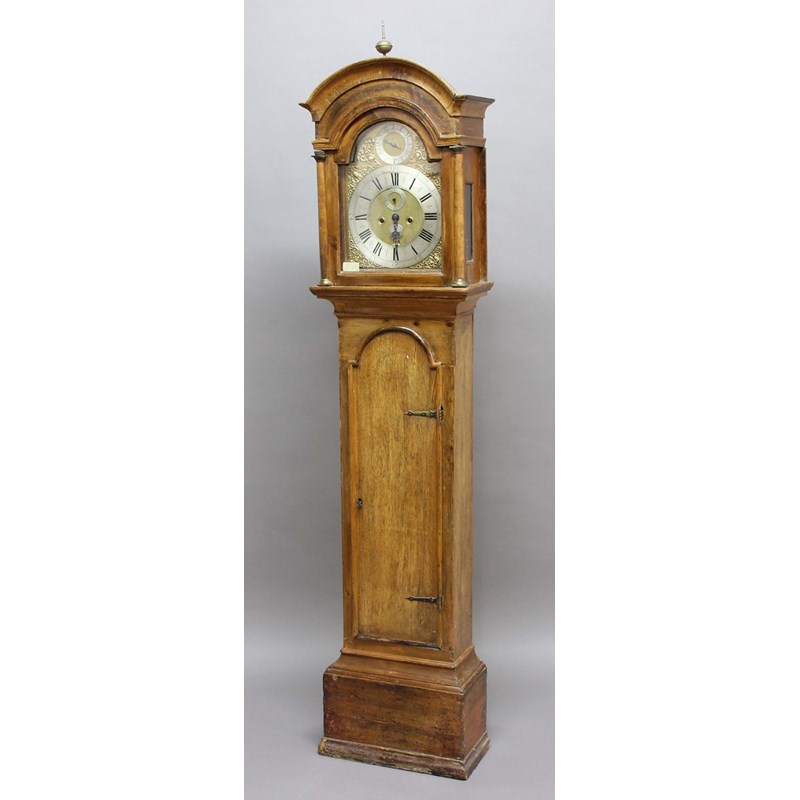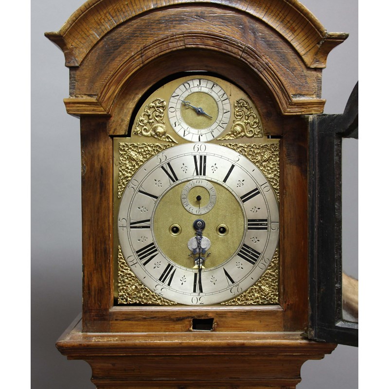 the 12" brass dial with 11" silvered chapter ring, with subsidiary seconds dial, date aperture and plaque inscribed Natt. Seddon, St James', London, and beneath a silvered month dial to the arch, on a brass, eight day, five pillar movement with anchor escapement, striking to a bell, the case with domed hood and arched panel door, with key, pendulum and weights, height excluding finial 206cm