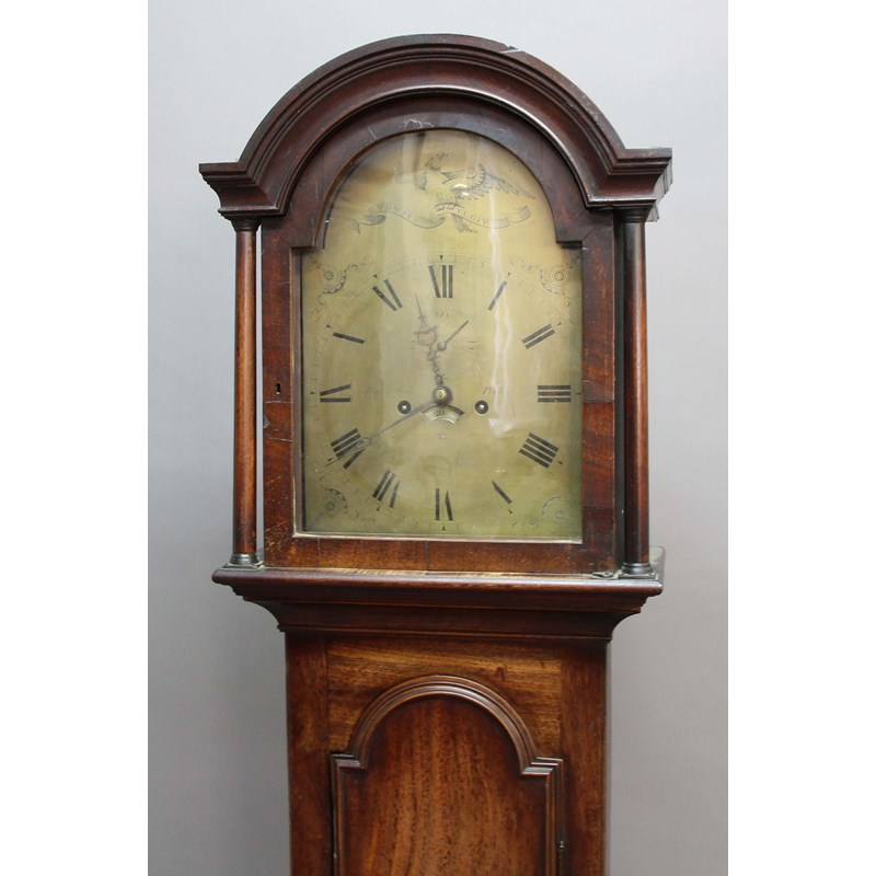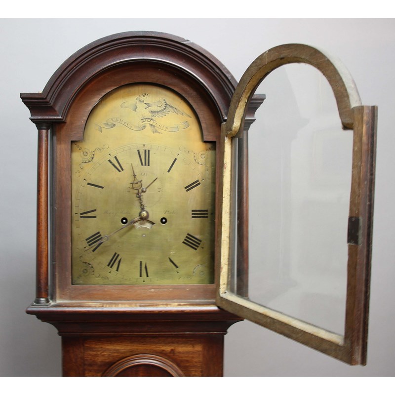 the 12" brass dial with subsidiary seconds dial and date aperture, inscribed Henry Watts, Poole beneath an eagle crest and the motto Tempus Fugit, on a brass eight day, four pillar movement hourly striking to a bell, the domed hood with three quarter columns, the case with arched door, with weights and pendulum, height 197cm