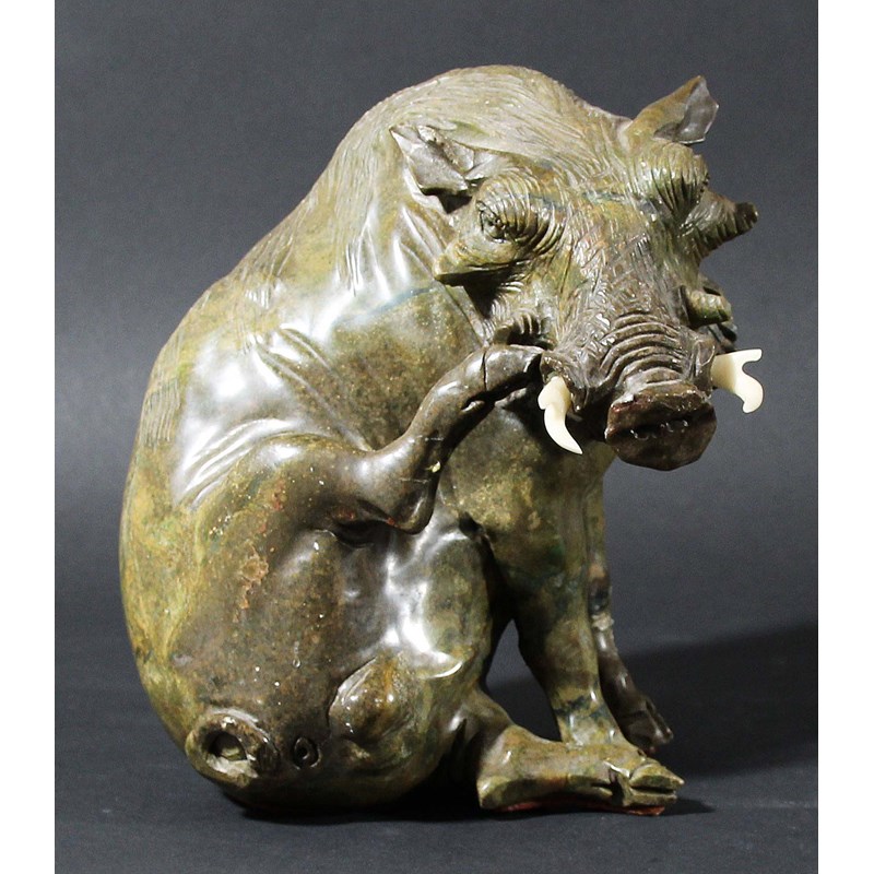 AFRICAN SOAPSTONE CARVING OF A WARTHOG, 20th century, modelled seated scratching his snout with a hind leg, height 18cm