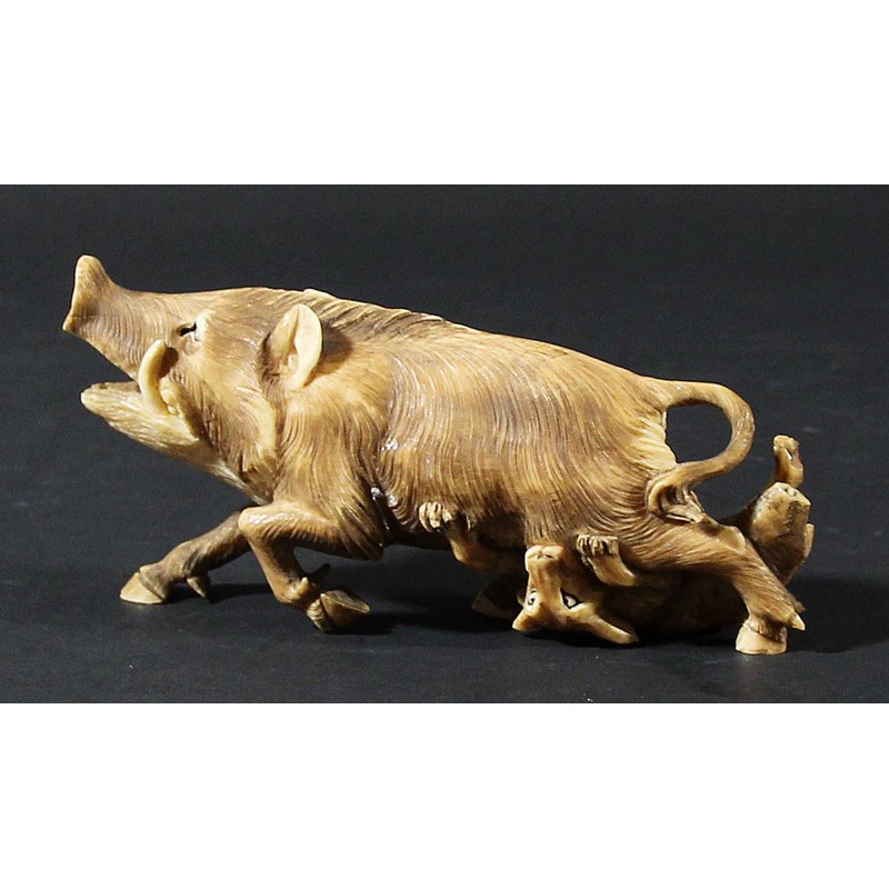 BONE CARVING OF A WILD BOAR AND DOG, 19th century, modelled running, the dog biting its hind leg, length 14cm
