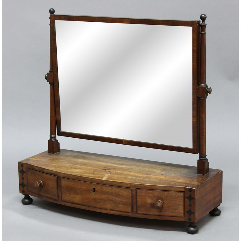 REGENCY MAHOGANY TOILET MIRROR, the rectangular plate on a bow fronted base with three drawers, one with a paper label for George Simson/Upholder/Cabinet Maker and Undertaker, with walnut inlay, height 63cm, width 64cm