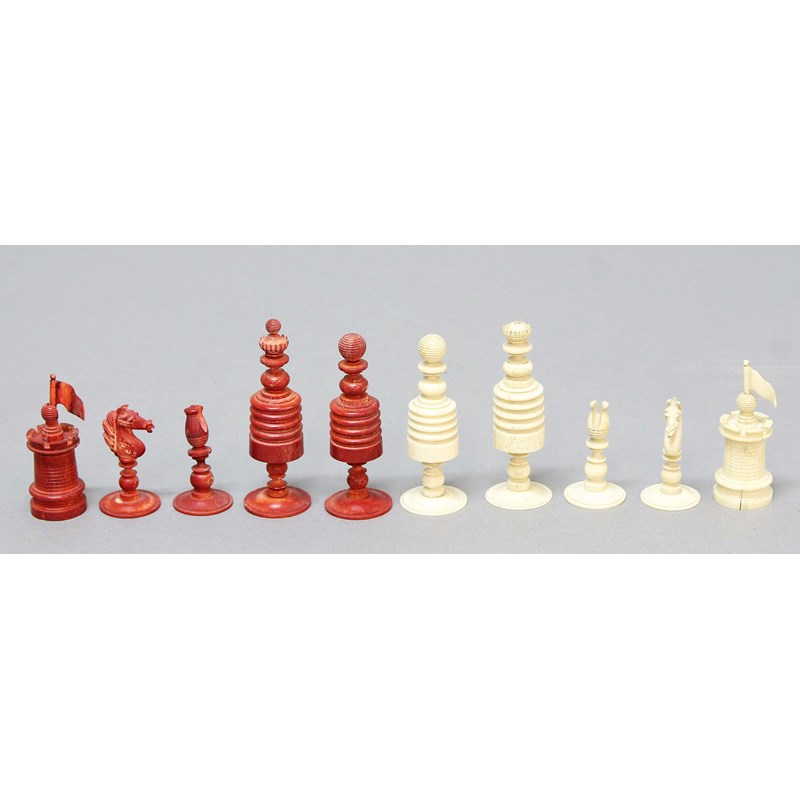 late 19th century, red stained and natural, height of king 9cm, height of pawn 4cm; housed in a leather bound History of Russia 'book' box with backgammon board inside (parcel)