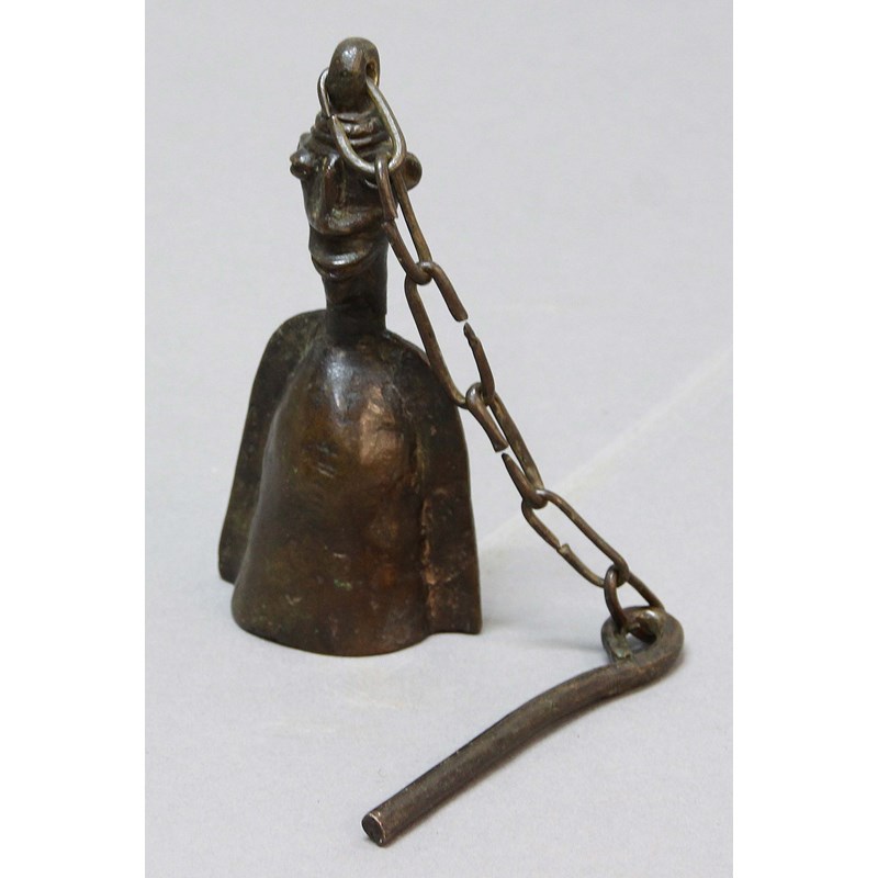 AFRICAN BRONZE FIGURAL BELL, possibly Benin, with chain and clapper, height 15cm