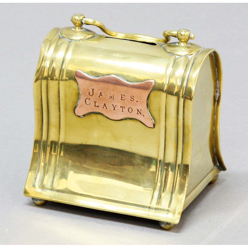 VICTORIAN BRASS MONEY BOX, of bell form with swing handle, a copper plaque inscribed James Clayton, height and length 12cm