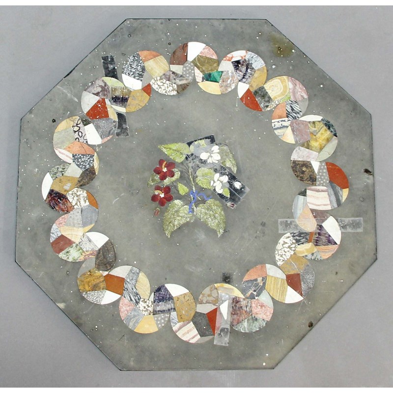 OCTAGONAL PIETRA DURA TABLE TOP, inlaid with hardstones and specimen marble with a central floral spray inside a wavy band, maximum width 52.5cm