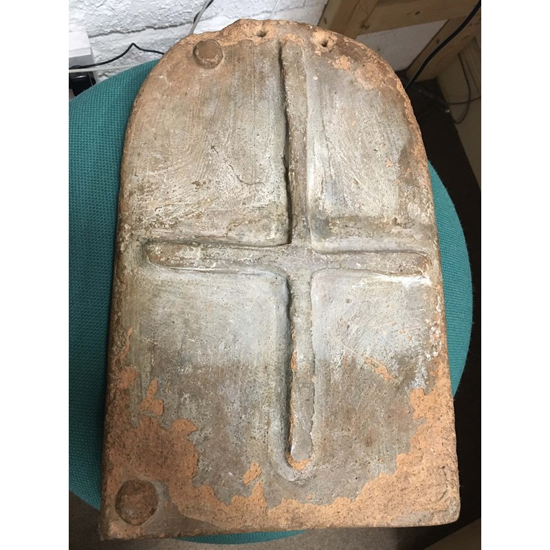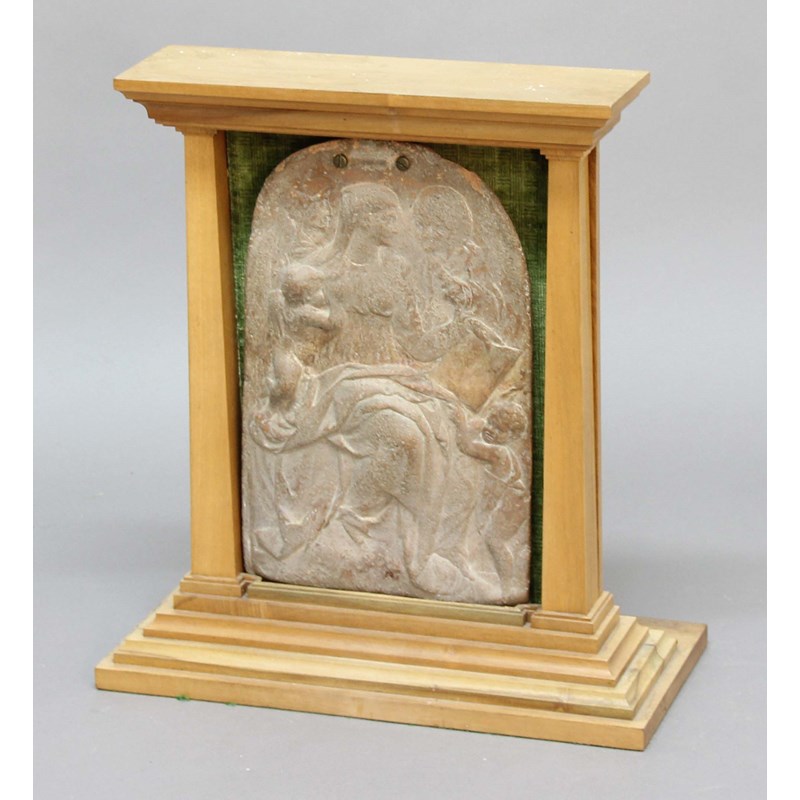 Virgin and Child, St Elizabeth, St Zechariah and St John, terracotta bas relief, probably 19th century, mounted in a wooden tabernacle stand, size of relief 39cm x 25cm