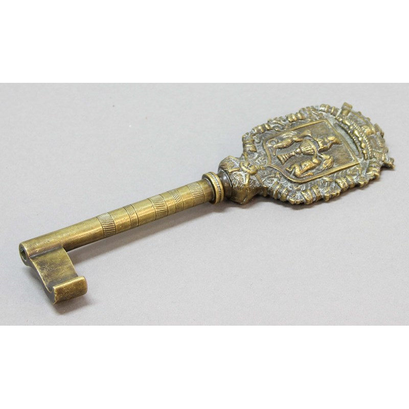 BRASS CHAMBERLAINS KEY, late 18th or 19th century, cast with a crest of a dragon and lion flanking an urn beneath a castle coronet, length 21cm, together with three others (4).