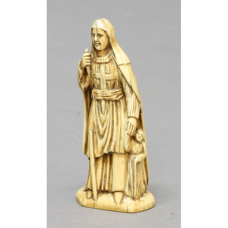 CONTINENTAL IVORY FIGURE, probably 18th century and possibly marine, carved as a figure holding a staff, a child to their side, height 12cm