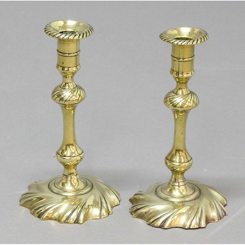 18th century, the sconce with rope twist rim above a wrythen knop, baluster column and twisting foot, height 22cm (2)