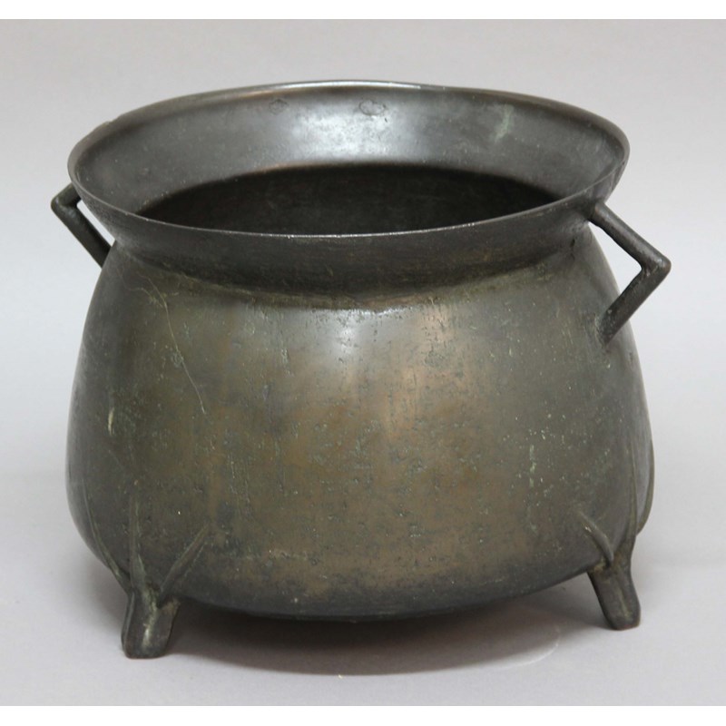 BRONZE CAULDRON, 17th century, of two handled ovoid form with flared rim and three short legs, height 29cm, diameter to rim 34cm
