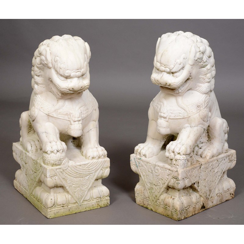 PAIR OF MARBLE CHINESE GUARDIAN LIONS, 20th century, carved seated with a front foot on a ball, on scrolling bases, height 65cm (2)
