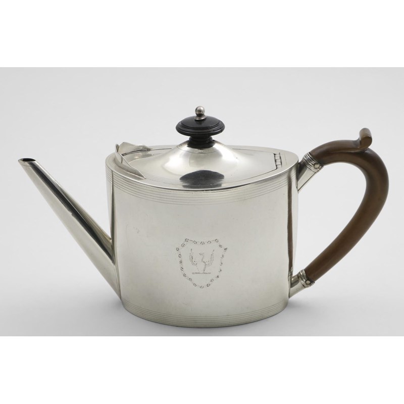 with a straight, tapering spout, light border engraving and a cartouche on each side, crested, the underneath with the scratchweight "17..9", by Henry Chawner, London 1792; 6.4" (16.5 cms) high; 17.65 oz