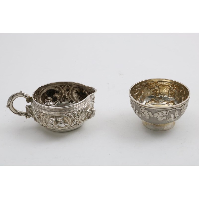 chased around the sides with cranes amongst trees and a vacant shield cartouche, gilt interior, maker's mark "T&C" (and character mark), c.1900, together with an Indian squat circular cream jug decorated around the sides in high relief with birds and animals; the former 3"  (7.6 cms) diameter;  6.5 oz  (2)