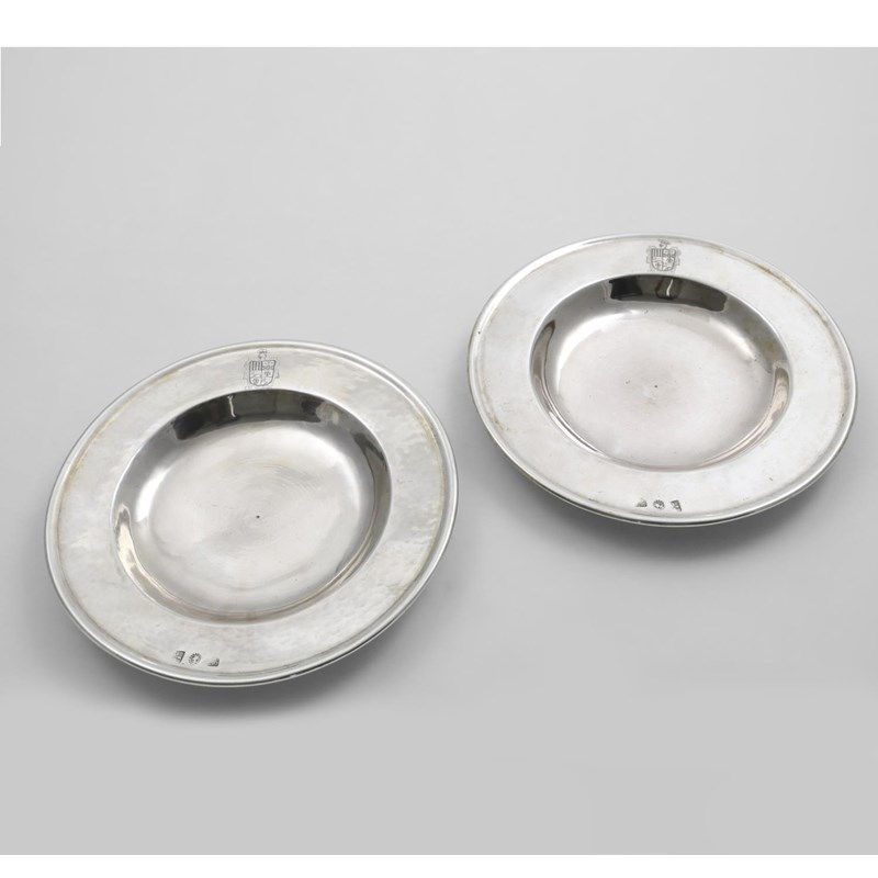 of plain circular form with moulded borders, each engraved on the rim with a coat of arms*, and initialled on the back "JA", maker's mark partially unclear, ("GV?L?"), Assay Master Francisco Alonso del Castillo, probably Cordoba early 18th century; 9" (22.7 cms) diameter; 31.5 oz (2)