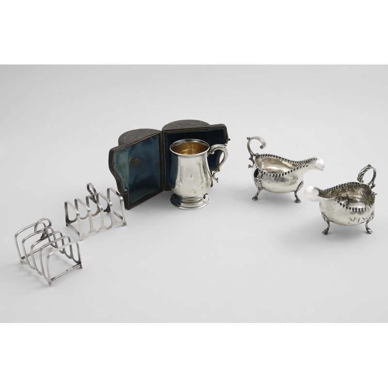 A George III sauce boat, a late Victorian sauce boat in a similar design, a pair of Art Deco small toast racks and a small baluster mug, monogrammed, by W. Gibson & J. Langman, London 1894 (in a lined & fitted case); the latter 3.5" (9 cms) high; 13.3 oz (5)
