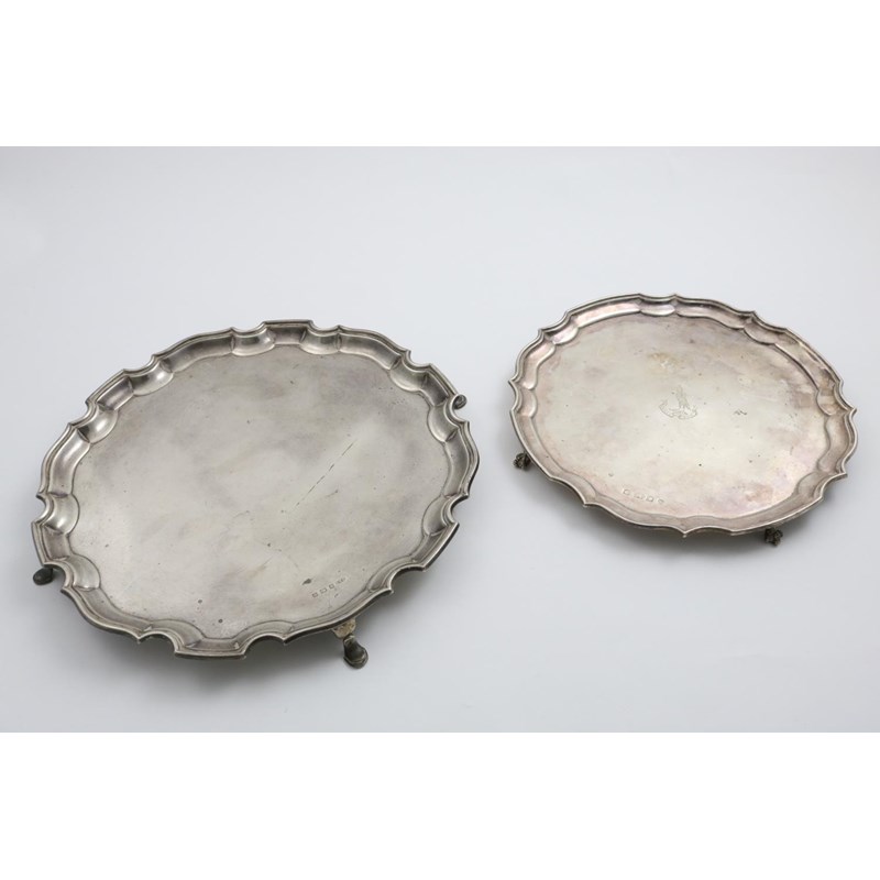 of shaped circular outline with a moulded border, maker's mark "D&B", Birmingham 1927 and a smaller salver with ball & claw feet, engraved in the centre with a crest & motto*, maker's mark "TW*Co.Ltd", Sheffield 1938; the latter 10" (25.5 cms) diameter; 39.65 oz (2)