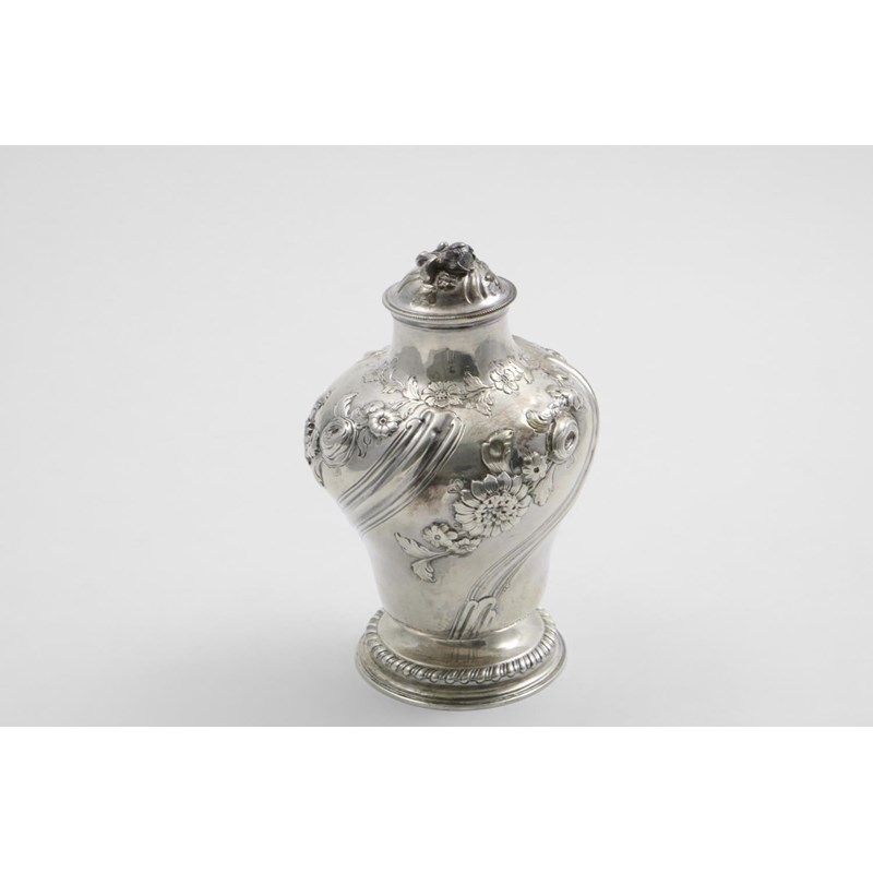 of vase form, decorated with wrythen fluting and repousse floral garlands, resting on a gadrooned foot, the cover with a flower finial, by Abraham Portal*, London 1762; 6.1" (15.5 cms) high; 7.5 oz
