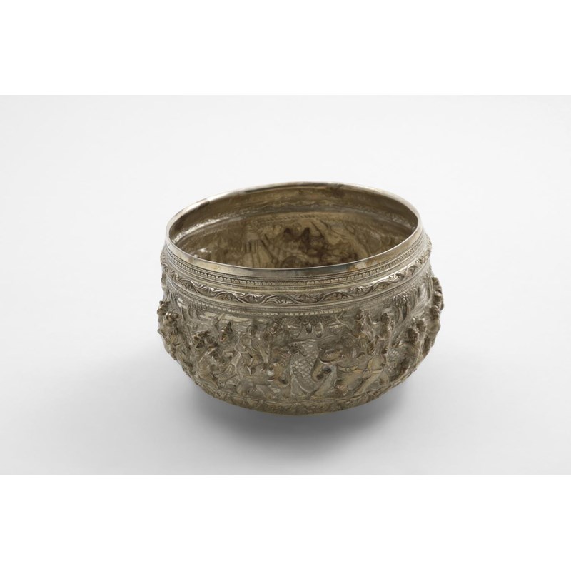finely chased and embossed with a frieze of scenes from the Jataka tales between a border of stiff leaves and an upper moulded border of scrolls, the base chased with an upper moulded border of scrolls, the base chased with a tiger, 1880-1900; 6.75" (17.2 cms) diameter; 19.70 oz