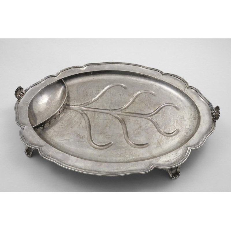 of shaped oval outline with a moulded rim, scroll feet and a small cast scallop shell handle at each end, the centre with a "tree & well" drainer and curved gallery, by Paul Storr, London 1827;  22.7"  (57.5 cms) long;  100.5 oz