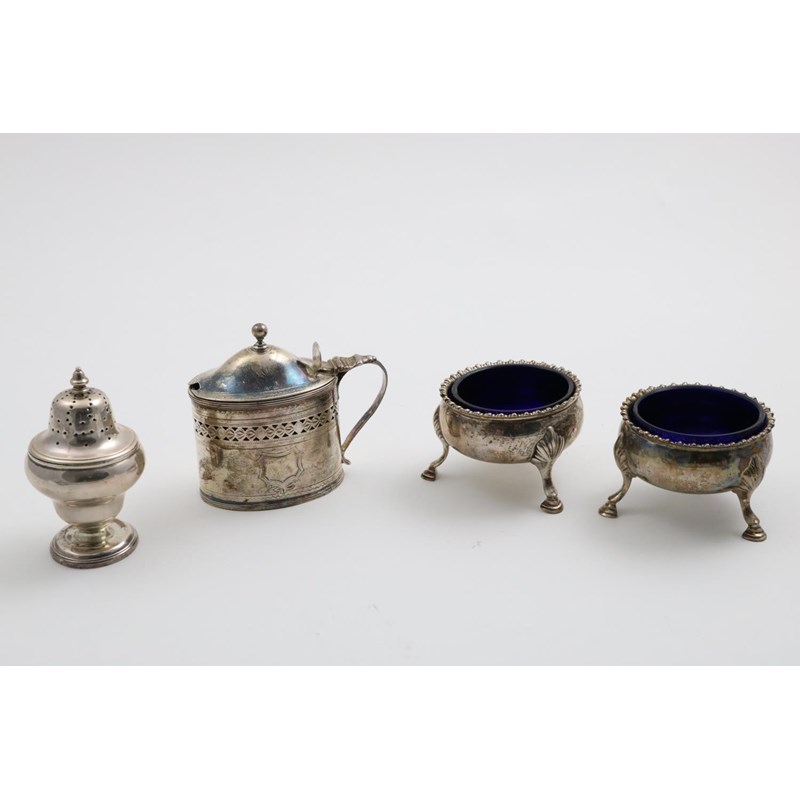 on three legs with gadrooned rims and blue glass liners, initialled "M" over "IH" underneath, by William Bond, Dublin 1789-90, together with a mustard pot (blue glass liner) by Henry Chawner, London 1795 and a George IV Scottish pepper caster; the latter 3.5"  (8.95 cms) high;  10.4 oz weighable silver  (4)