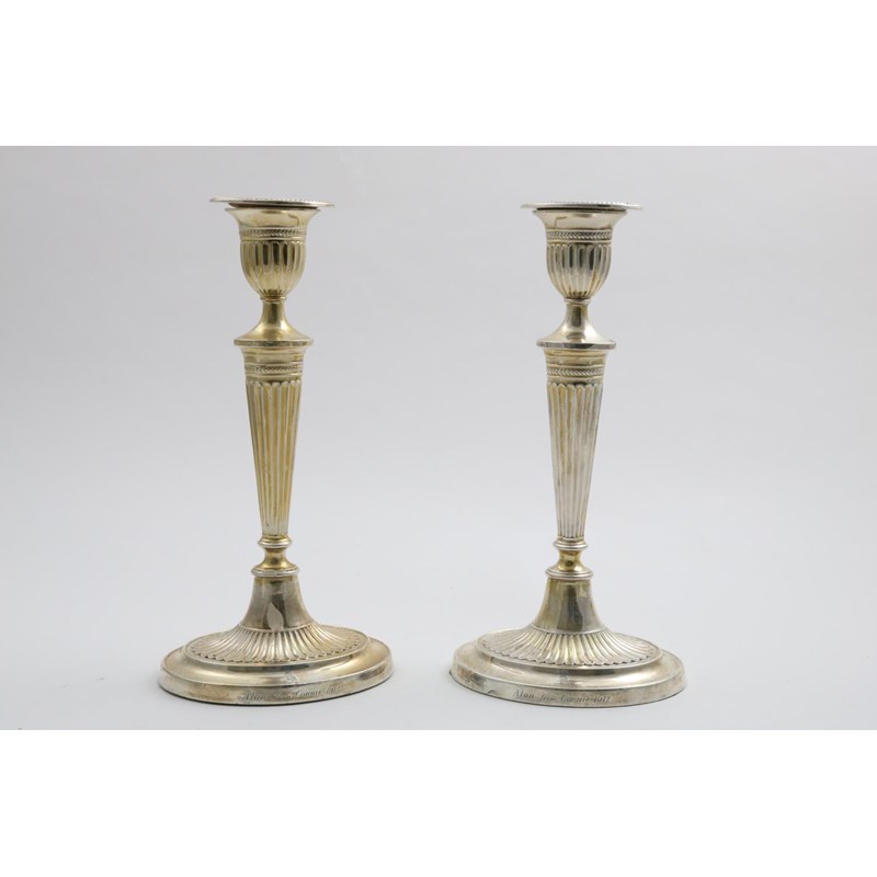on oval bases with tapering columns and fluted decoration, detachable nozzles, each one inscribed "Alan from Connie 1912" on the side of the base and crested, by W. Fordham and A. Faulkner, Sheffield 1911; 11.5" (29 cms) high (2)