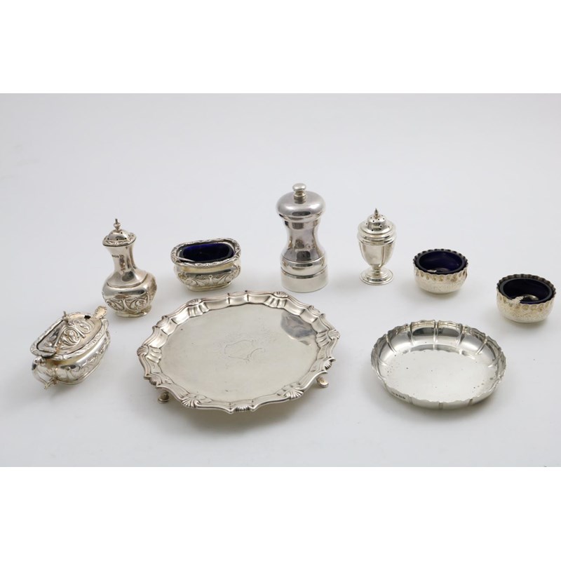A George II waiter with an engraved coat of arms in the centre & initials, by Robert Abercrombie, London 1739, together with seven various condiments, four condiment spoons and a small "Strawberry" dish by Sebastian Garrard, London 1919; the latter 4.25"  (10.5 cms) diameter;  17.4 oz weighable silver  (lot)