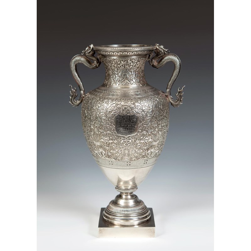 A MID 19TH CENTURY CHINESE HORSE-RACING TROPHY CUP in the form of a vase with two dragon handles and a square pedestal base, the body and neck profusely chased with flowers & foliage on a matt ground, interspersed with ho-ho birds and banded by formal borders of vitruvian scrolls, gadrooning & Greek-key motifs, the front with an applied shield, inscribed "HONG KONG RACES 1850 CELESTIAL CUP Presented by D. JARDINE Esq., won by MR DUDGEON'S g.a.h. GREAT WESTERN, Ridden by J. King Esq., HM. 59th REGT.", struck underneath with pseudo marks and the maker's mark "KHC", by Khecheong of Canton c.1850; 15.9" (40.5 cms) high, 83.45oz *Provenance: To the original recipient and thence by family descent to the vendor. **Shown at The Great Exhibition of 1851.