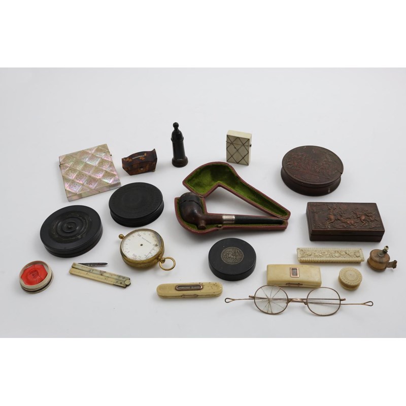 A Victorian mother of pearl card case, three various ivory toothpick boxes, two other small ivory boxes, a mounted wooden pipe, various wooden boxes, a rule, a gilt-metal pocket barometer, a wooden tape measure, the small figure of a saint on a turned wooden stand with a screw-on cover, etc.; the card case 4" (10 cms) long (lot)