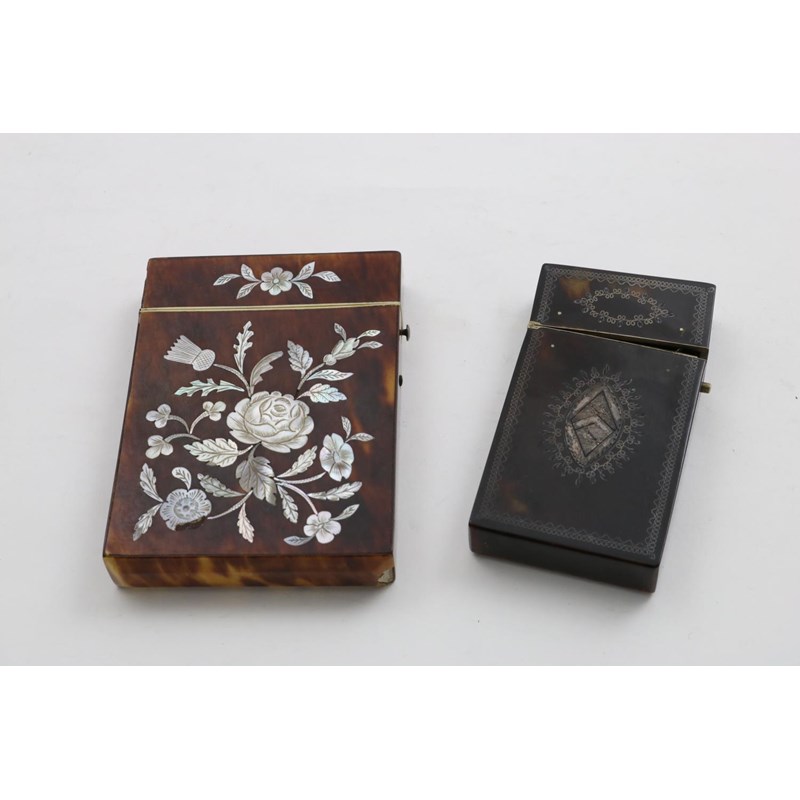 with a coat of arms on one side and the initials "GAB" on the other, the interior with six fittings, together with an early Victorian mother-of-pearl card case with mother-of-pearl floral inlay; the latter 4" (10 cms) long (2)