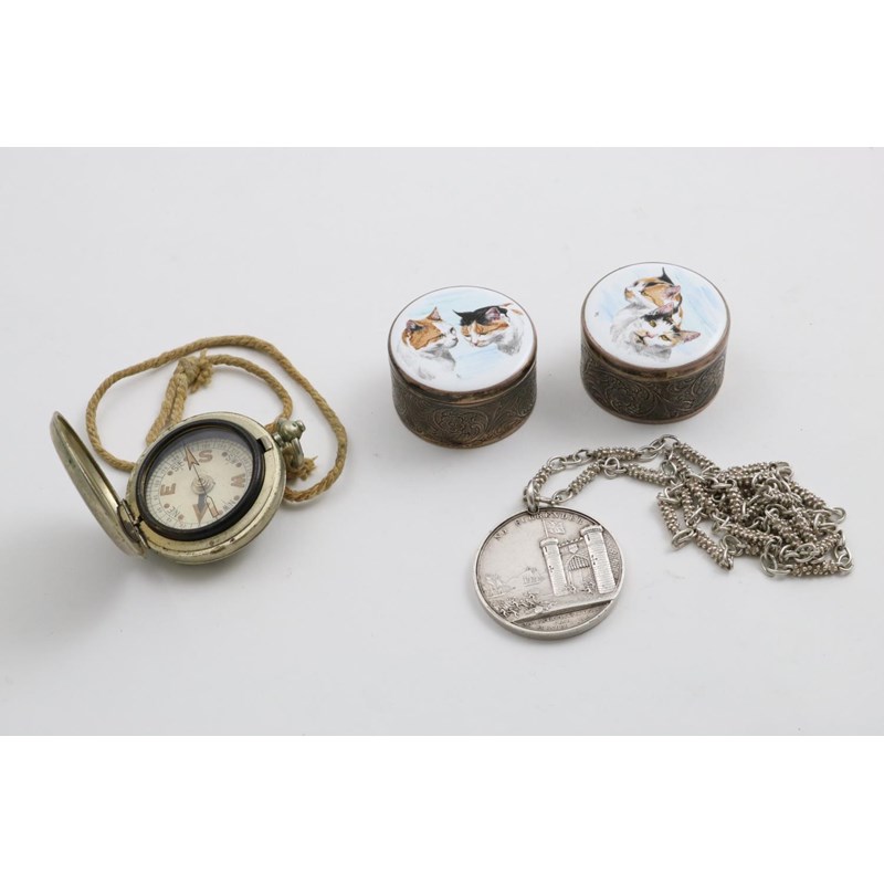 by W.S. Mossop lacking original suspension ring but with a later chain & jump ring, together with two Elizabeth II Scottish small boxes, enamelled on their covers with cat portraits, and a nickel pocket compass; the medal 41 mm diameter; 4 oz weighable silver (4)
