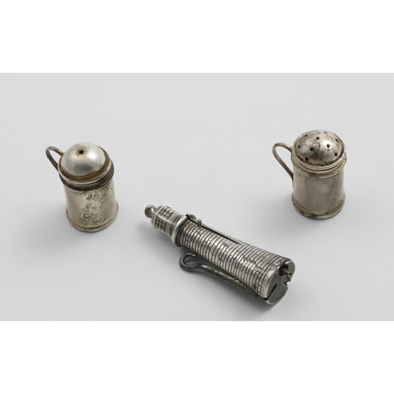 in the form of a lighthouse, marks worn, probably by Horton & Allday, Birmingham c.1880, together with a pair of miniature or toy kitchen peppers; the latter 1" (2.7 cms) high (3)