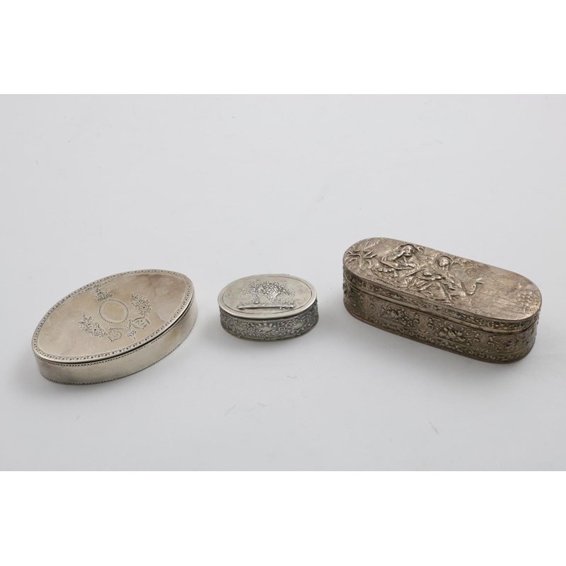 A GEORGE III NAVETTE-SHAPED SNUFF BOX with engraved decoration, by T. Phipps & E. Robinson, London 1785-90 (date letter worn) and two other Continental, decorative boxes; the largest on 4.75" (12 cms) long; 9 oz (3)