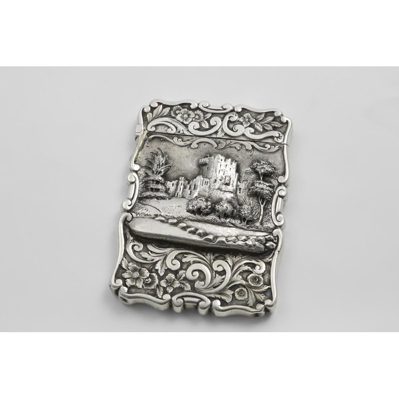 of shaped rectangular outline with a view of Blarney Castle, Cork in high relief, bordered by chased scrolls, the reverse also with chased scrolls and a vacant shield cartouche, by Frederick Marsden, Birmingham 1870; 4" (10.3 cms) long; 2.1 oz (2)