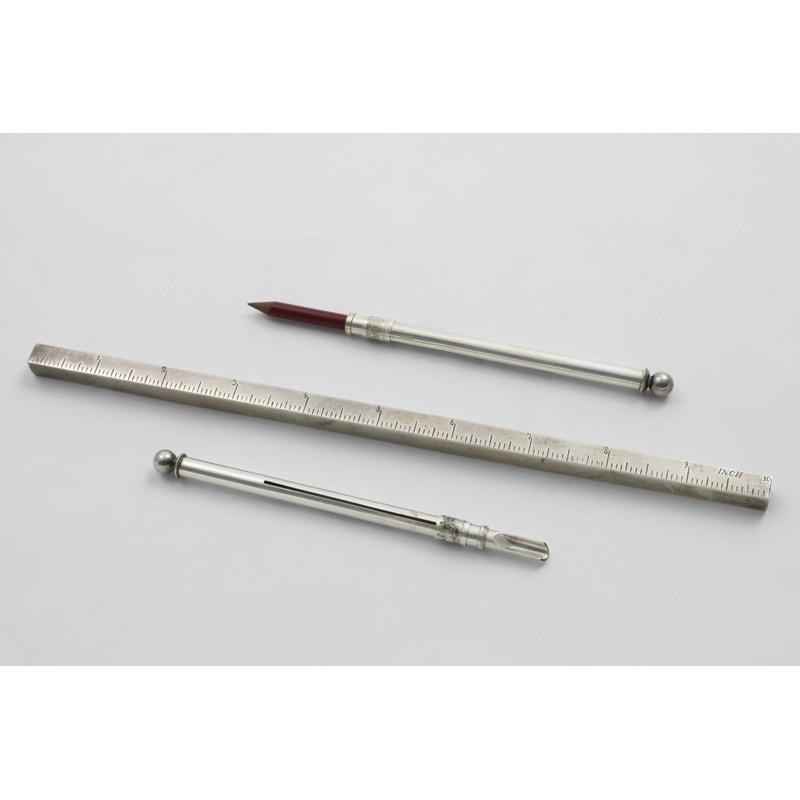 of square section, calibrated in inches (up to 10), with a pull-out pencil at one end and a pull-out dip-pen at the other, with English import marks for Murrle, Bennett and co., London 1901; 10.9" (27.5 cms) long; 1.7 oz