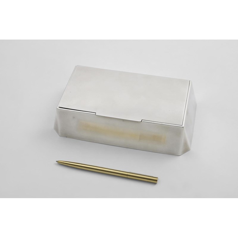 of oblong form with angled sides and corners, engine-turned decoration and a light-coloured wood lining, inscribed inside "Xmas 1941 Rene Francis" by S.J. Rose, London 1936 (retailed by Fortnum & Mason), together with a gold-plated Bulgari "Eccentric" ball point pen with two refills; the box 8" (20 cms) long (2)