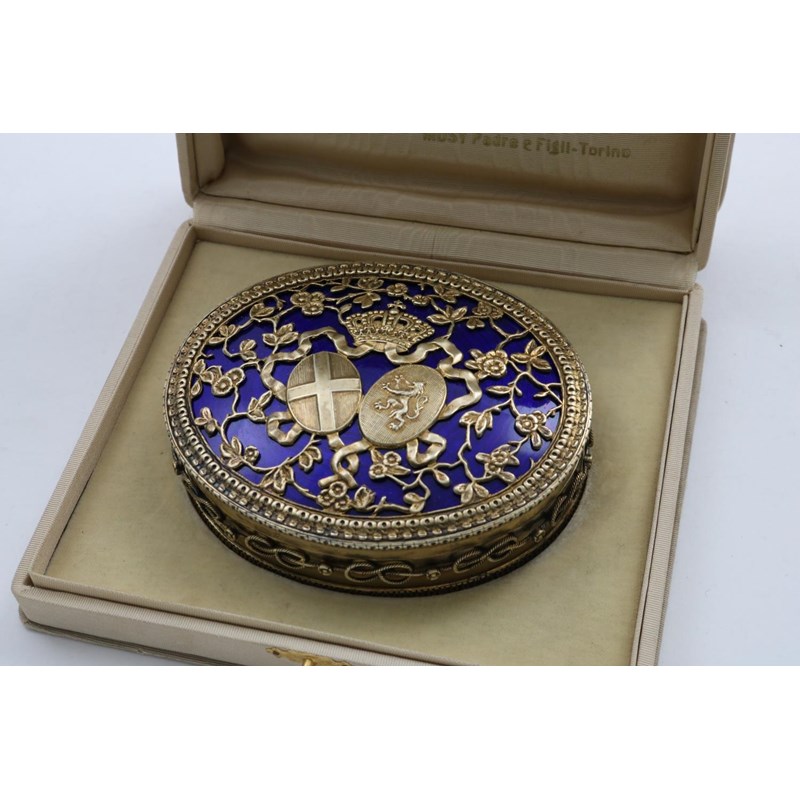 oval with a pull-off cover and a border of knotted wire around the sides, the base inscribed "Roma 8 Gennaio 1930", the cover with a dual coat of arms, by Musy of Torino, in a fitted silk-covered box with an applied coronet, the base with a label "Succession Grande-Duchess Josephine-Charlotte de Luxembourg"; 4" (10 cms) long; 7.7 oz gross