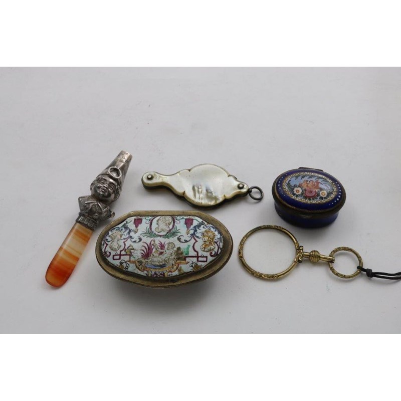 A SILVER GILT AND ENAMEL SNUFF BOX probably German c.1740; 7.5 cms (damaged), a Victorian silver mounted teether, a silver and mother of pearl lorgnette and two other items (5)