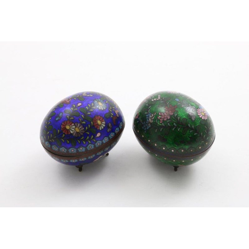 TWO CLOISONNE ENAMEL EGG SHAPE BOXES with a floral design on a green & blue ground respectively on feet; 9 cms (2)