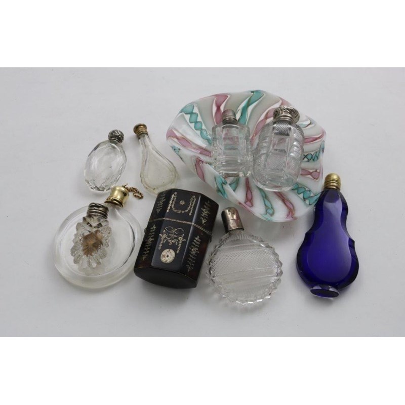 Seven various bottles, all 19th century, a blue glass bottle, a striped glass dish and a tortoiseshell and silver pique bottle case, c.1800 (10)