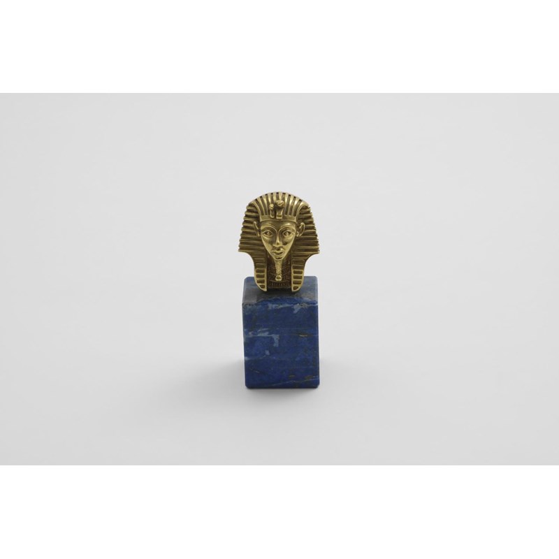 AN ELIZABETH II LIMITED EDITION, 18 CT. GOLD CAST MINIATURE REPRODUCTION OF TUTANKHAMUN'S FUNERAY MASK, mounted on a lapis-lazuli plinth, (with certificate), maker's mark "PPS", London 1972; 3.25" (8.2 cms) high; 1.5 oz (47 grams) weighable gold.