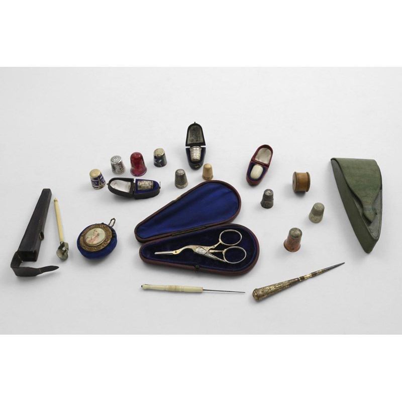 An Edwardian thimble with an agate top (cased), an ivory thimble cased), another by Charles Horner, Chester 1913 (cased), a continental example with a butterfly, and Arts & Crafts copper thimble set with a three-penny piece in the top, a gold and enamel thimble and a small quantity of non-precious thimbles/sewing items (lot)