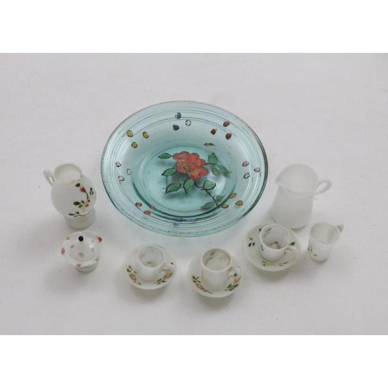 AN 18TH CENTURY MILK GLASS DOLL'S TEA SET ten pieces, and a painted glass dish; 7 cms