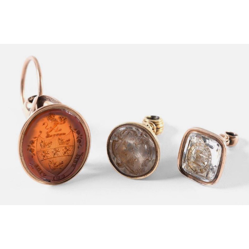 THREE GOLD FOB SEALS each with heraldic intaglio stones, early 19th century (3)